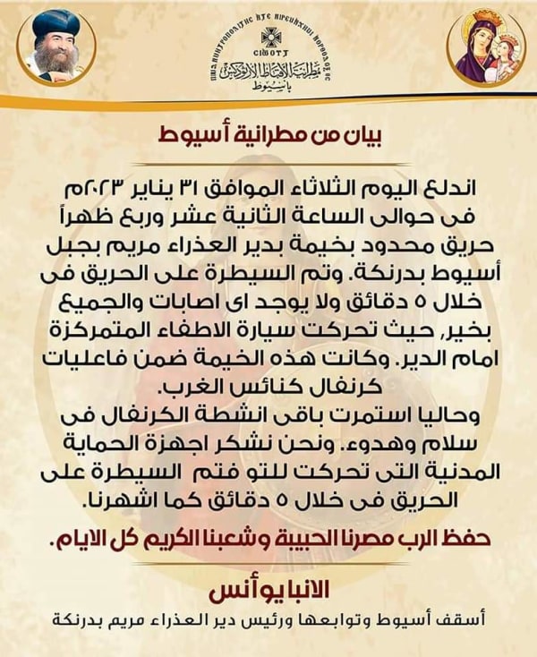 وقالت مطرانية أسيوط في بيان لها اليوم، اندلع اليوم الثلاثاء الموافق 31 يناير 2023م في حوالى الساعة الثانية عشر وربع ظهرًا، حريق محدود بخيمة بدير العذراء مريم بجبل أسيوط بدرنكة، وتم السيطرة على الحريق في خلال 5 دقائق ولا يوجد اسى إصابات والجميع بخير.