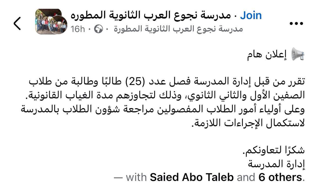 كما بدأت المدارس نفسها تعلن عن صدور قرارات فصل لعدد من الطلاب بسبب الغياب ، حيث أعلنت مدرسة نجوع العرب الثانوية المطورةبالشرقية ، أنه تقرر فصل 25 طالبا وطالبة من طلاب الصفين الإول والثاني الثانوي لتجاوزهم مدة الغياب القانونية ، مشددة على أولياء الأمور بمراجعة شئون الطلاب بالمدرسة لاستكمال الإجراءات اللازمة