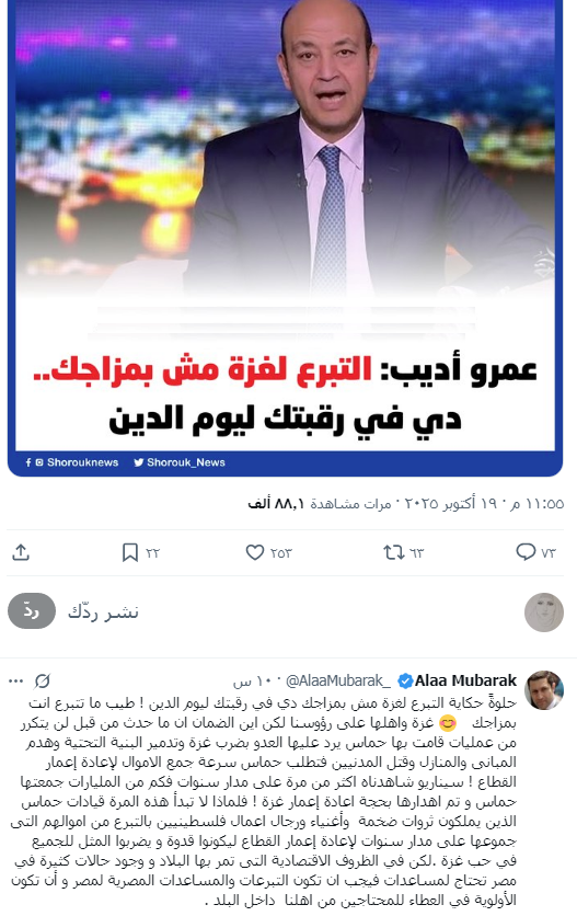 وعلق علاء مبارك، عبر منصة "أكس"، ردا على إلزام عمرو أديب المصريين للتبرع لـ إعمار غزة: "حلوةً حكاية التبرع لغزة.. مش بمزاجك، دي في رقبتك ليوم الدين! طيب ما تتبرع أنت بمزاجك.. غزة وأهلها على رؤوسنا،
