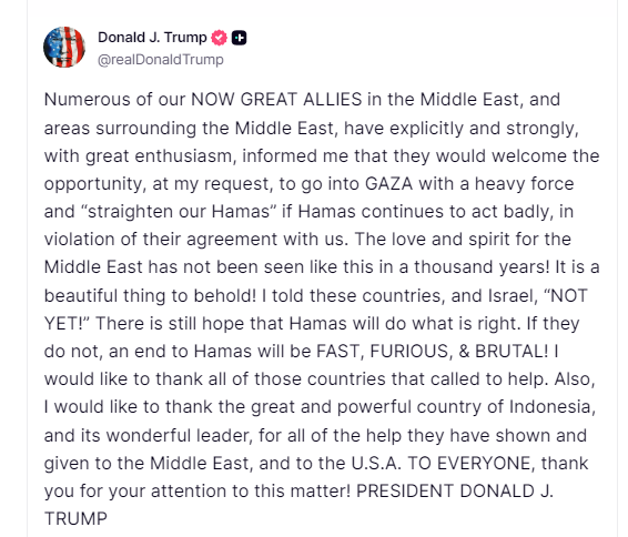وقال ترامب في تدوينة له على منصة تروث سوشال: عدد من حلفائنا العظام الآن في الشرق الأوسط والمناطق المحيطة به أبلغوني بوضوح وبقوة، وبحماس كبير، أنهم سيرحبون بالفرصة، بناءً على طلبي، للدخول إلى غزة بقوة عسكرية كبيرة وتأديب حماس إذا استمرت حماس في التصرف بشكل سيّئ، في انتهاكٍ لاتفاقها معنا.