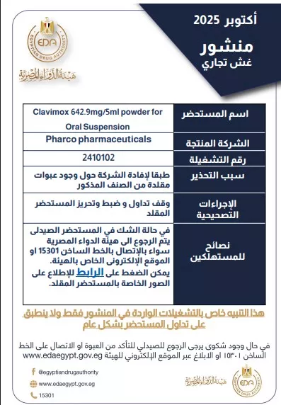 تفصيلياً، ذكرت في منشورها رقم 74 لسنة 2025، أن التشغيلة "2410102" من دواء "Clavimox 642.9mg/5ml powder for Oral Suspension" غير صالحة للاستخدام، مرجعة ذلك لإفادة الشركة حول وجود عبوات مقلدة من الصنف المذكور.