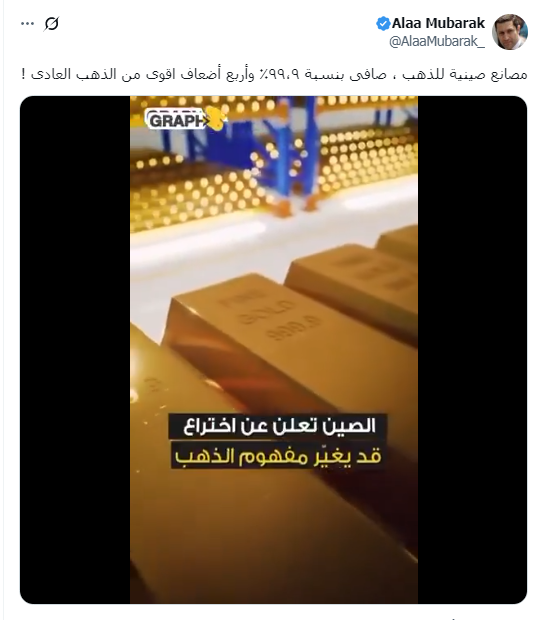 وقال علاء مبارك عن الذهب الصيني: "مصانع صينية للذهب، صافى بنسبة 99.9% وأربع أضعاف اقوى من الذهب العادى!"