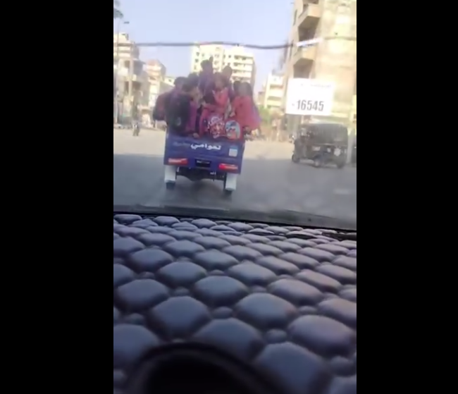 تداول نشطاء مواقع التواصل الاجتماعي مقطع فيديو كارثي، يظهر مجموعة من الأطفال الصغار، أثناء خروجهم من المدرسة، ونقلهم عبر دراجة بخارية "تروسيكل"، مركبة بثلاث عجلات تعمل بمحرك، ويركب عليها أكثر من 10 تلاميذ.