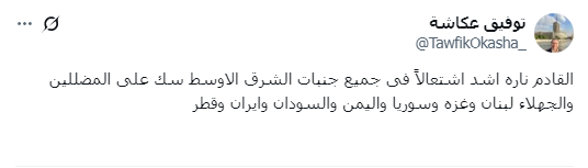 وقال توفيق عكاشة، عبر منصة "إكس"، في تحذيره بشأن ما سيحدث في منطقة الشرق الأوسط في الفترة المقبلة: "القادم ناره أشد اشتعالًا فى جميع جنبات الشرق الأوسط سك على المضللين والجهلاء.. لبنان وغزة وسوريا واليمن والسودان وإيران وقطر".