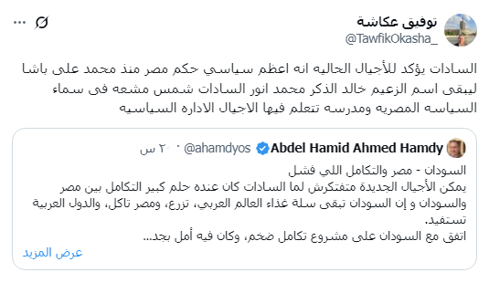 وقال توفيق عكاشة، عبر حسابه بمنصة "إكس"، عن إدارة الرئيس الراحل السادات لأزمة السودان: السادات يؤكد للأجيال الحالية أنه أعظم سياسي حكم مصر منذ محمد على باشا ليبقى اسم الزعيم خالد الذكر محمد أنور السادات شمس مشعة فى سماء السياسة المصرية ومدرسة تتعلم فيها الأجيال الإدارة السياسية.
