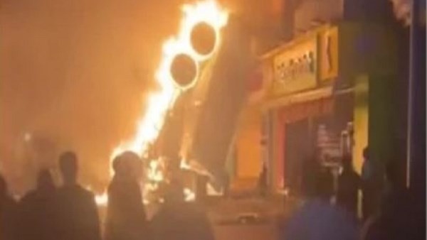 سقوط تريلا بترسا يتسبب في تدمير سيارات واندلاع حريق بعقار وكافيه