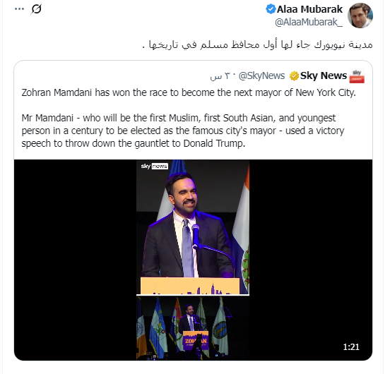 وقال علاء مبارك، عبر حسابة بمنصة "أكس"، معلقًا على فوز زهران ممداني: "مدينة نيويورك جاء لها أول محافظ مسلم في تاريخها".