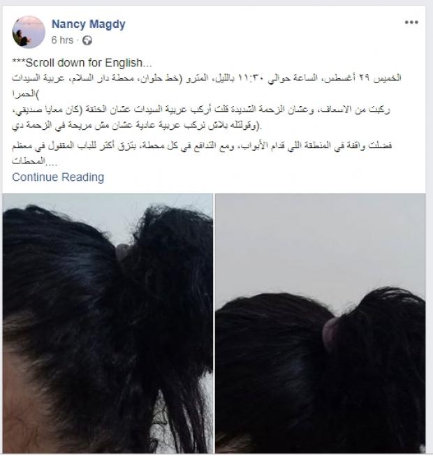 منشور لفتاة تُدعى "نانسي مجدي" حقق نحو 6 آلاف مُشاركة، بعدما سردت الفتاة، عبر حسابها الشخصي على موقع التواصل الاجتماعي "فيسبوك" تفاصيل واقعة الاعتداء عليها، مُرفقة القصة بصور لها، خاصة لشعرها الذي تعرض للقطع على يد من قالت إنهما اعتديتا عليها.